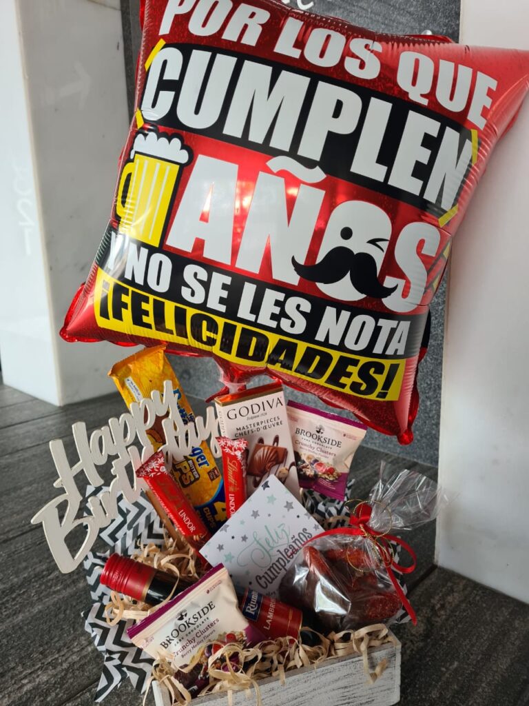 Llénalo con tus favoritos con globo, chocolates importados, artesanales, licores, quesos, embutidos y muchas cosas más.